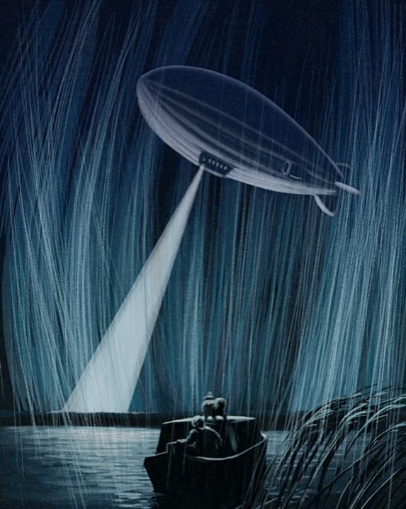 They fled towards the safety of the Fens and witnessed a flaming zeppelin crash.[2] His figure was described as bulky, and he wore oilskins and a sou'wester.[3]